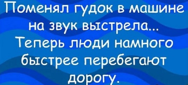 Старый гаишник уходит в отпуск, оставляет вместо себя молодого и говорит: — Вот тебе презерватив — и чтобы, когда вернусь из отпуска у тебя всё было: и машина, и квартира, и т.д. Приходит из отпуска, видит: у молодого гаишника ничего нет. — Ну, — говорит, — тогда смотри и учись. Останавливает водителя: — Вы пьяны, дышите! Оштрафовал. Штрафует второго, третьего… Четвёртый водитель недоумевает: — Это не трубка, это презерватив! Гаишник ему: — Трезвый, проезжайте… Москва, Рублевское шоссе, Инспектор ДПС останавливает Бентли, превышение скорости трехкратное, Бентли останавливается, приоткрывается наглухо тонированное стекло. Гаишник под козырек: — Инспектор Петров, ваши документы. Из Бентли высовывается рука с пятитысячной купюрой, инспектор прячет ее в нагрудный карман. — Всего хорошего, постарайтесь больше не нарушать. Из окна появляется следующая купюра того же достоинства. — И, будьте внимательны, через два квартала еще один экипаж. Снова пятитысячная. Гаишник, вглядываясь в номер маши