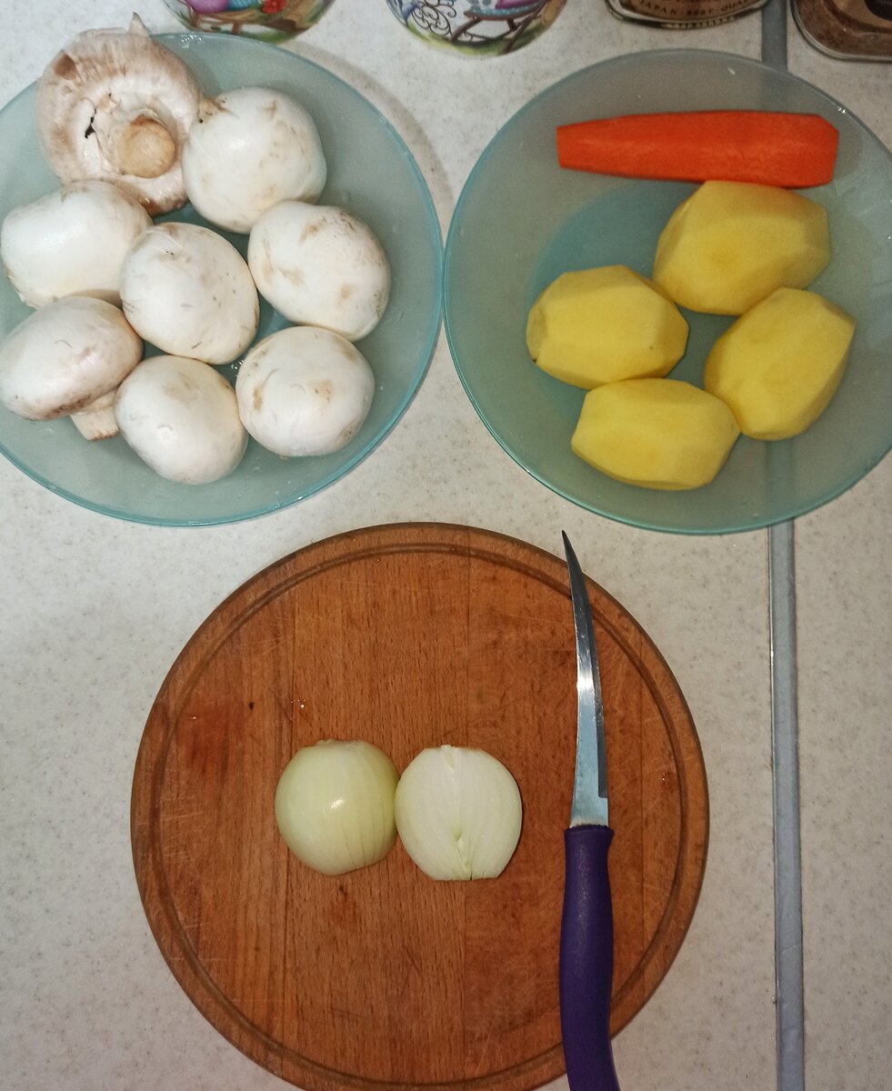Нарезаем овощи, пока бульон варится и обжариваем лук, морковь и грибы .