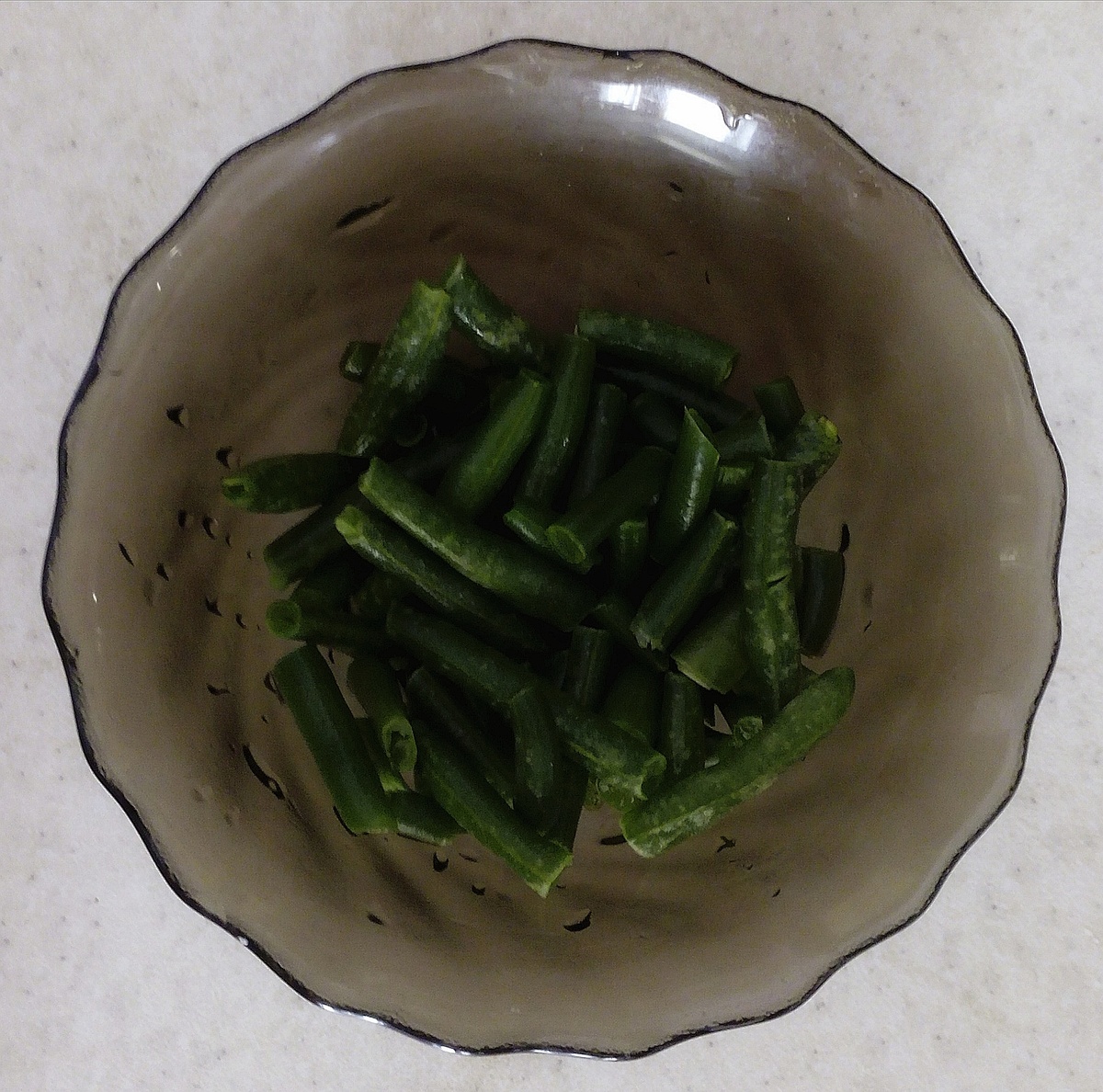Приготовим начинку для пиццы. Стручковую фасоль тщательно промыть водой, отбросить на дуршлаг и оставить на 10 минут. Зеленую фасоль выложить в миску и налить 2 ложечки растительного масла. Лучок отчистить от кожуры, затем нарезать тонкими полукольцами.