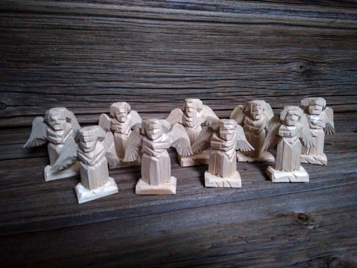 #Ангелы. Миниатюрная скульптура в духе сергиевской маховой резьбы, резал глядя на ангелов работы мастера Александра Варганова. Ростом вместе с подставкой от 7 до 8 см, размах крыльев от 7 до 10 см. Липа, подставка из сосны, покрыты акриловым лаком.