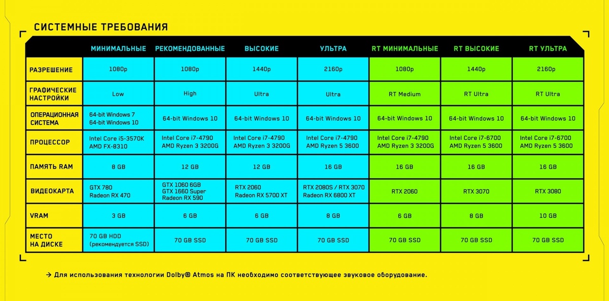 - Авторы Cyberpunk 2077 указали, что для корректной работы тайтла с включенным рейтрейсингом потребуется система с 16 ГБ оперативной памяти, процессором Intel Core i7-4790 или AMD Ryzen 3 3200G и видеокартой RTX 2060. Для игры в разрешении 4K понадобится CPU модели i7-6700 от Intel или AMD Ryzen 5 3600, а также RTX 3080.