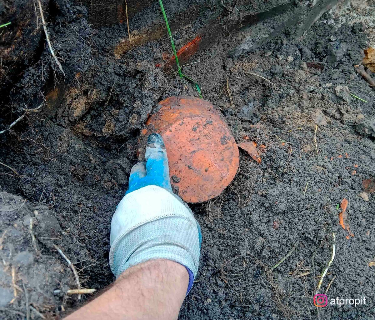 Не успели мы прокопать и метра, как нам попался глиняный горшок, он лежал дном вверх. Так как таких горшков - обманщиков мы откопали много, уже знали, что он будет не целый, так и вышло. Но всё равно удостоверились, что в нём ничего нет.