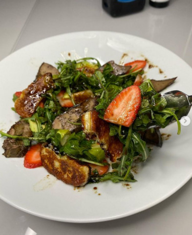 Ингредиенты на 2 большие салатницы : Печень индейки -400 грамм; Сыр халлуми -200 грамм; Рукола -100 ; Авокадо хасс -1 шт; Клубника -10 шт; . Заправка : Масло оливковое -4 ст.л; Гранатовый соус -1,5 ст.л; Бальзамический крем -1,5 ч.л; Мёд -1 ч.л; Соль и перец . Печень обсушиваем и выкладываем на разогретую сковородку с маслом , по 4 минуты с каждой стороны . Не солим , не перчим !!! Закрываем крышкой и готовим 12 минут . Почти в самом конце добавляем соль и перец . . Руколу замачиваем в воде на 10минут . . Сыр нарезаем на кусочки и обжариваем на Оливковом масле по 3 минуты с каждой стороны . .