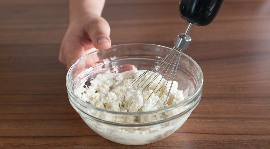 Творог выложите в глубокую миску. Добавьте ванильный сахар, сметану и взбейте погружным блендером. Положите изюм и перемешайте. Начинку уберите в холодильник до использования.