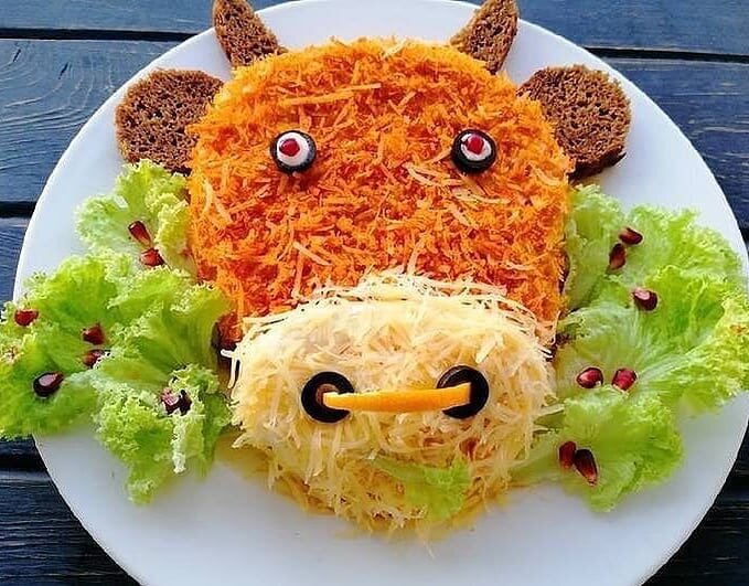 🔷Четвертый - яичные белки. Но не все. Надо оставить 1 белок или даже 1,5 для формирования мордочки быка. Смазать майонезом по желанию.