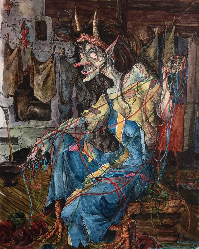 Ещё один поменявший облик персонаж. Вот почему болота? Откуда Высоцкий это взял? Ну да ладно. Это вредный (чаще всего, хотя есть вариант и духа - помощника, женой домового) дух, который имеет вид безобразной старушки/старичка, с рогами, хвостом, шерстью, перьями, в общем куча описаний. Но все они неприятны. Она может завестись, если дома не всё хорошо, или же если колдун/ведьма подложили куклу, которая и стала кикиморой. Или же злые строители тоже могли стать причиной её появления, так что не ссорьтесь со строителями!