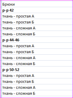 Бюджет продаж и расчет себестоимости очень сильно привязан к специфики деятельности предприятия, поэтому сложно сделать общую модель без привязки к реальному объекту, особенно в производстве. В данной статье для примера рассмотрим расчет продаж, себестоимости и валовой прибыли производства брюк. Цена брюк может зависеть от следующих факторов: Исходя из рассмотренных факторов сложности, для бюджета продаж примем такую классификацию: Для расчета выручки продаж нужно занести планируемое количество и цену без НДС по каждой группе. (Если цены внутри группы будут сильно отличаться, возможно, нужно будет добавить еще одну группу.) Важно!!! Группировка должна быть понятна, при отслеживании факта не должно возникать сложностей отнесения продукции в ту или иную группу. После того как классификация проведена заполняет данные по планам В данном примере, цена на готовую продукцию не зависит от размера. Теперь приступаем к себестоимости, расчет себестоимости лучше делать на отдельном листе, так