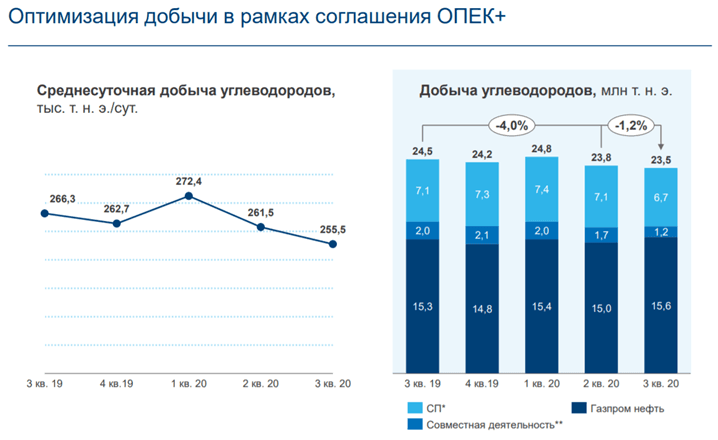 Если кто помнит отчет за 2 кв 2020 года и недельный обзор №13. Где мы уже видели, что соглашение ОПЕК+ никак не повлиял на добычу Газпром нефти. В 3 кв 2020 года ничего не поменялось. Добыча по сравнению с 3 кв 2019 года снизилась всего на 4,1%! При этом другие нефтяные компании снизили добычу более чем на 10%.