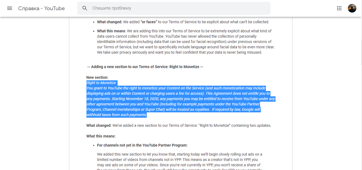 Там прямо говорится о том, что Ютуб имеет право вставлять рекламу в ваши видео, а вы не имеете права на какие-либо выплаты. Примерно такой перевод этого абзаца.
