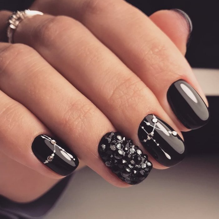 Блестящие стразы на ноготках привлекают внимание к женским рукам не меньше ювелирных украшений. Именно поэтому, прекрасные дамы активно используют в маникюре этот удивительный вид декора, имитирующий сияние драгоценных камней и металлов. Такое оформление уместно смотрится в любой ситуации, будь то праздничное мероприятие, где нужно выглядеть на все сто, или обычная прогулка по магазинам с подругами. Особенно эффектно в компании со стразами смотрится чёрный лак, который ,по мнению стилистов , является показателем элегантности и уместен в образе любой барышни. Классический чёрный цвет очень выигрышно подчёркивает мерцание и блеск камней, гармонично сочетается с другими оттенками, что позволяет уверенно экспериментировать при выборе дизайна, а также прекрасно смотрится на ноготках любой длины и формы.