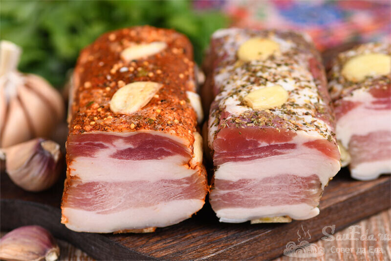 9. Через 5 дней соленая свиная грудинка готова. Вынимаем ее, нарезаем на тонкие кусочки и подаем на стол. Она получается в меру соленой, очень ароматной и вкусной. Вкусы разные. Домашний деликатес своими руками.