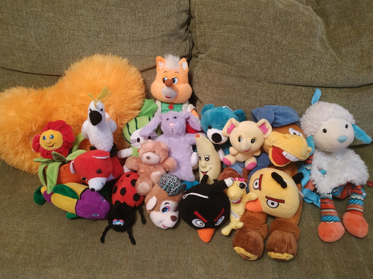 Все игрушки мягкие, большинство этих игрушек мы с мелким поймали в игровых автоматах. Ну знаете такие - кидаешь 10 руб и надеешься на удачу. И знаете, нам
