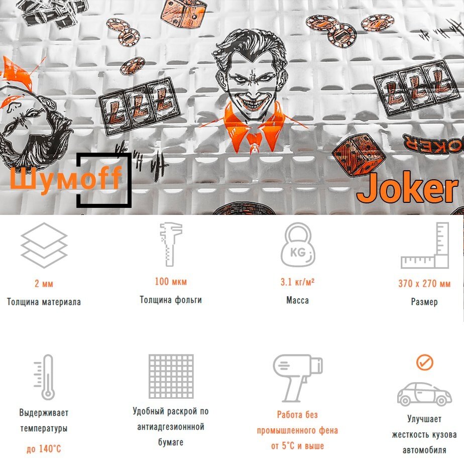 При введении углеродосодержащих минеральных компонентов в мастику Шумоff Joker (Джокер), удалось повысить когезионную прочность мастик. За счет этого увеличен показатель данного материала «Адгезия к монтажной поверхности». Также улучшена стабильность показателей КМП, пенетрация (жесткость) в температурном диапазоне -20°С - +60°С. Мастика материалов Шумоff Joker классически черного цвета и не имеет запаха. В тоже время, Шумоff Joker выделяется эксклюзивным дизайном картинки на фольге материала. Толщина фольги 100 мкм, размеры листов 370*270 мм. Выдерживают температуры до 140°С