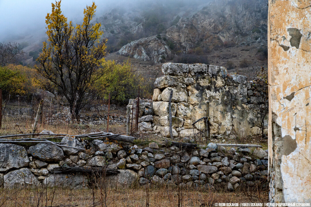 Мы немного побродили по окрестностям руин. На фото ниже хорошо видно, как облако наплывает на склон, создавая мистическую атмосферу среди развалин. Вдалеке виднелись чьи-то могилы. Мне подумалось, о том, ходит ли их кто-то навещать? В таких местах всегда думается о Вечном и бренном. Под сенью гор понимаешь истинный масштаб своего бытия.