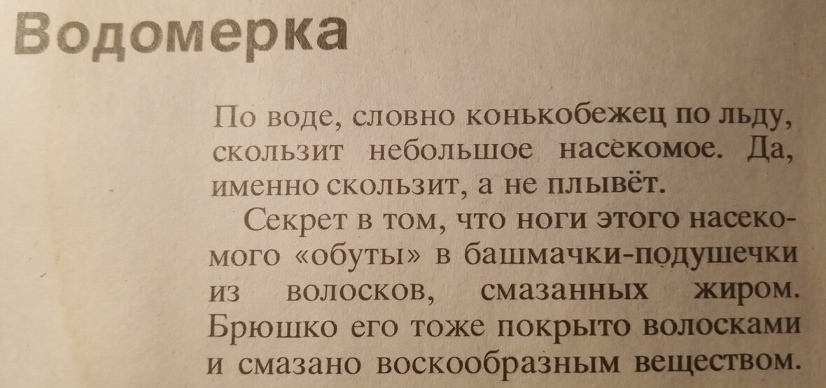 По воде, словно конькобежец по льду, скользит небольшое насекомое. Да, именно скользит, а не плывет.