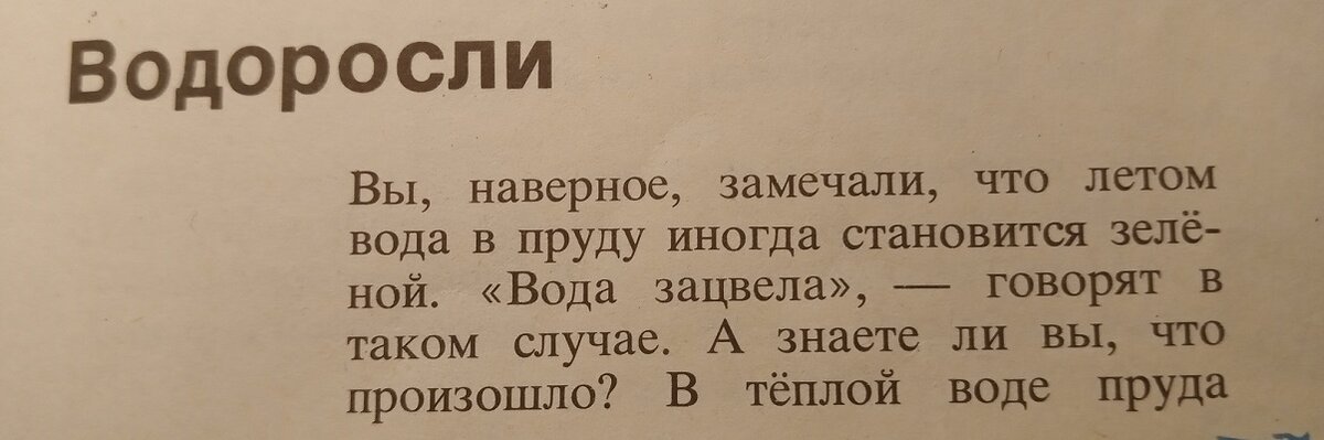 Вы, наверное, замечали, что летом вода в пруду иногда становится зелёной. «Вода зацвела», — говорят в таком случае. А знаете ли вы, что произошло? В тёплой воде пруда стали очень быстро размножаться особые растения — водоросли. Они и окрасили воду в зелёный цвет. Если вы рассмотрите «зелёную» воду под микроскопом, то увидите много маленьких зелёных шариков — это и есть колонии водорослей.