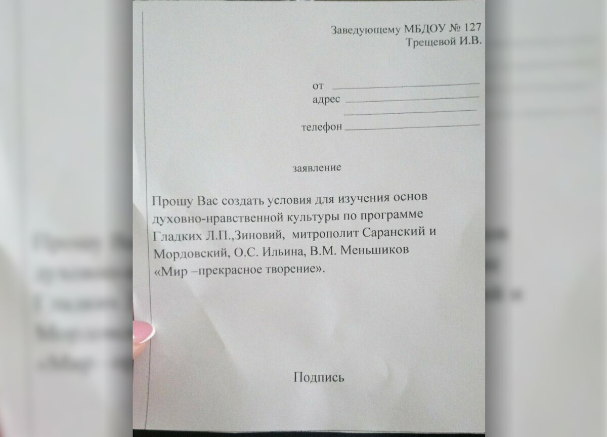 Родителям выдали заявление на согласие преподавать религиозные уроки в старшей группе. Судя по заявлению речь идет про детский сад комбинированного вида №127, который является бюджетным муниципальным дошкольным учреждением.