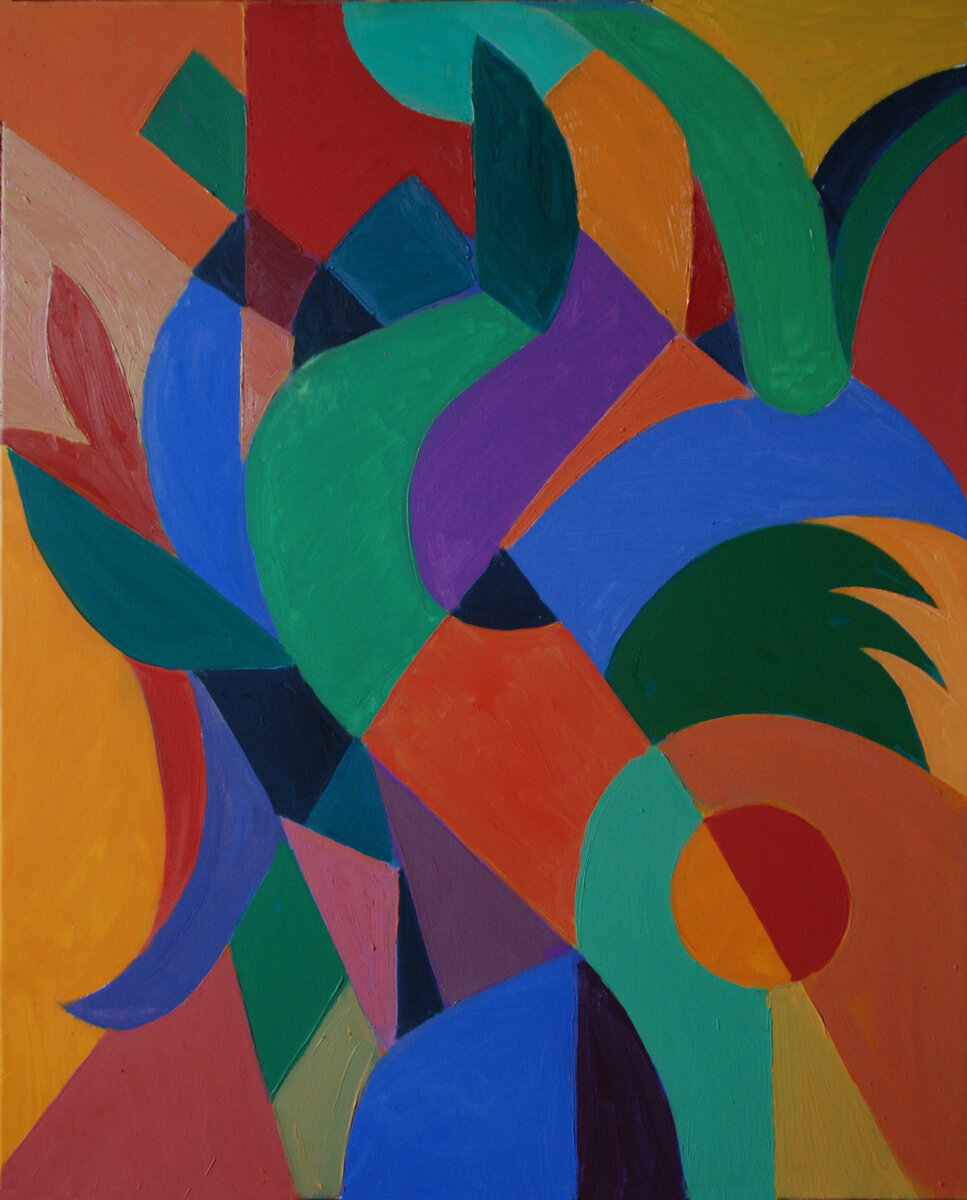 Множество форм, благодаря, в том числе, цвету, формируют трехмерное пространство на плоскости холста — темное отступает назад и углубляется, светлое — выходит вперед. Перед нами вольное изображение курортного города! Пальмы, солнце, море!