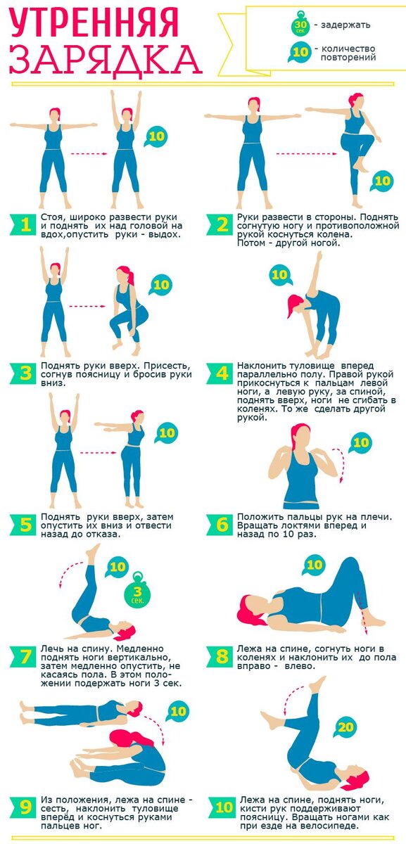 ✏Соблюдайте регулярность утренней гимнастики. Упражнения раз в неделю не дадут никакого эффекта.