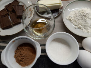 Прежде всего подготовим все ингредиенты - все должно быть под рукой. Приготовление быстрое, поэтому все действия выполняем четко, но без суеты. Первым делом взбиваем яйца с сахаром до пышной массы. Миксером будет быстрее. Далее в сотейник разламываем на кусочки шоколад, добавляем размягченное сливочное масло.