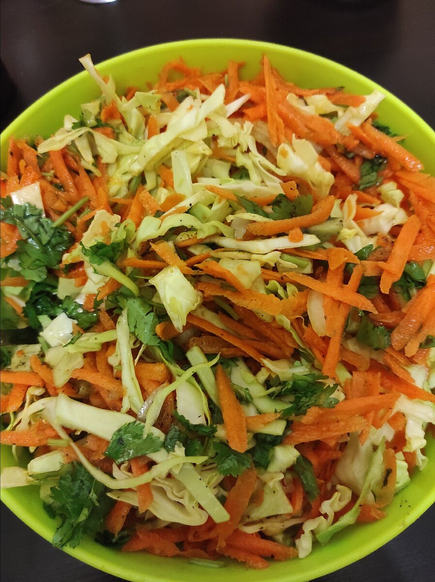 Хочу предложить вкусный рецепт популярного салата из капусты. Капусту тонко нарезать, морковь потереть на крупной тёрке, лук нарезать тонкими полукольцами, огурец соломкой, зелень ( я люблю с кинзой). Для заправки использую оливковое масло, соль, перец молотый.