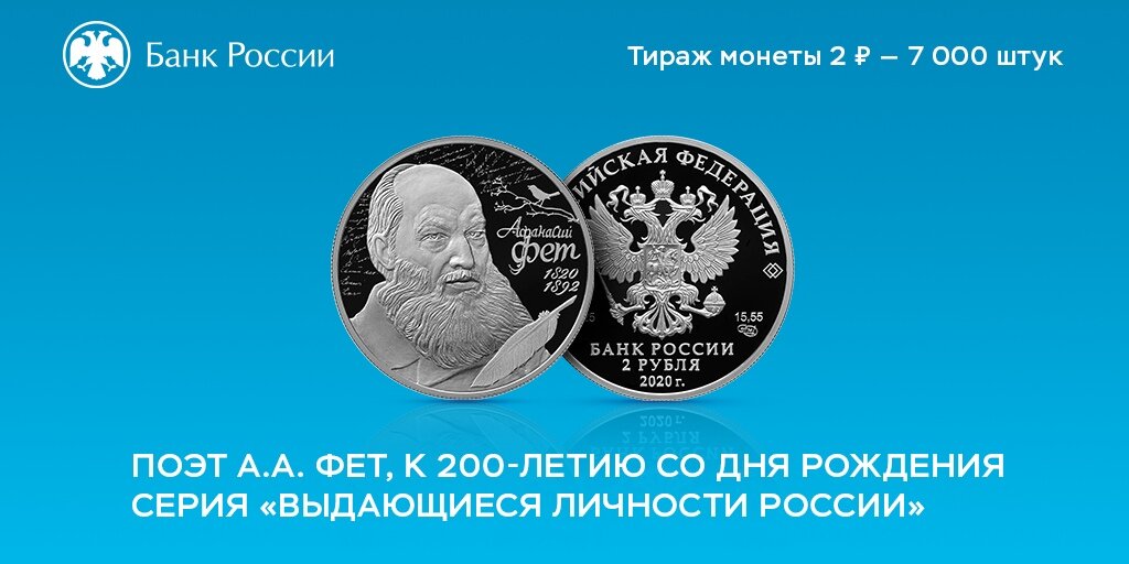 Банк России 17 ноября 2020 года выпустил в обращение памятную серебряную монету 2 рубля 2020 «Поэт А.А. Фет, к 200-летию со дня рождения» (каталожный № 5110-0166).