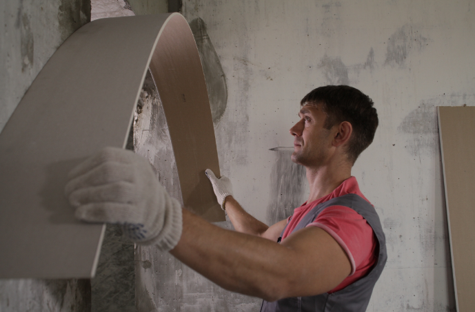 Прежде чем согнуть лист гипсокартона, следует сконструировать шаблон с нужным радиусом изгиба. Для этих целей идеально подходят такие материалы, как остатки ДВП, ДСП и фанера. Шаблон должен быть немного меньше, чем задуманная конструкция.