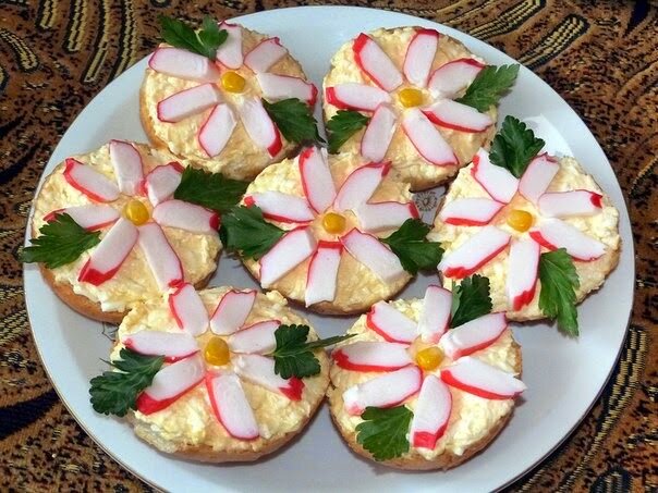 5. На каждой булочке выложить из крабовых палочек цветок, в середину положить зерно кукурузы, из петрушки сделать листики. Можно подавать.