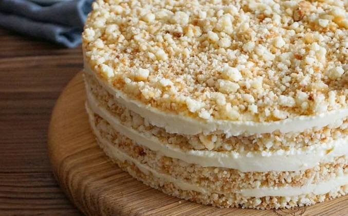 3. Собираем в кольце 16-18 см. Крошка, крем, крошка, крем, сверху крошка. Дать тортику постоять несколько часов в холодильнике.