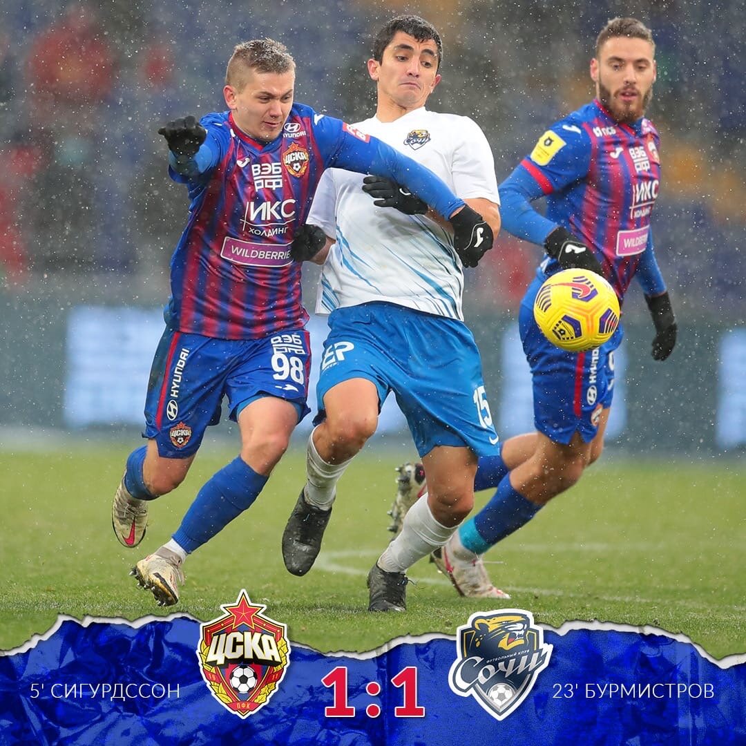 После первого мяча забитого армейцами на 5-ой минуте ЦСКА ожидаемо снизил темп игры и отдал инициативу Сочи, которое не прочь было ею воспользоваться. Опасные атаки сыпались как снег в декабре, а защита не успевала за всеми игроками атакующей группы Сочи. Равенства на табло ждать не пришлось, после неудачной игры в штрафной центральных защитников ЦСКА, Никита Бурмистров мастерски отправил мяч в сетку. После, штурм ворот армейцев не прекратился, яркое подтверждение не засчитанный гол Артура Юсупова.
