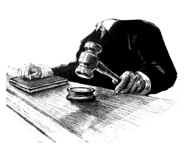 На столе, за которым разместились я и мой оппонент, мы начали спешно раскладывать бумаги, готовясь к предстоящему слушанию. Спустя какое-то время на экране появились трое судей, едва они успели занять свои места, из динамиков раздался оглушительный крик одного из них: "Перестаньте шуршать бумажками"!!! Женский голос, издавший этот возглас, был очень высокий и громкий. Дело было в громкости динамиков, отчего голос казался гораздо выше, чем при живом общении. Возмущение судей по видимому было связано с микрофоном для конференц-связи, стоящим на нашем столе рядом с разложенными бумагами. Шуршание бумаг создавало звуковые помехи. Но взгляд мой в этот момент был прикован к экрану. Дело в том, что камера, транслирующая нам изображение судей из соседней комнаты, была настроена так, что голов судей решительно не было видно. Головы уходили куда-то за границы экрана. Все трое судей, и когда они стояли и после того, как уселись на свои места, изображались совершенно безголовыми. Это было очень непривычно и крайне забавно.