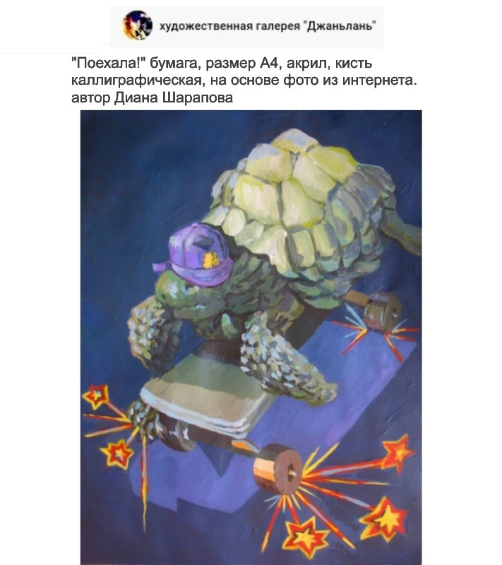 вот она, кстати, содержит "конфликт". Неподвижное медлительное существо и символ быстрого передвижения для детей и подростков. Моё решение - очеловечить образ. Добавить бейсболку, чтобы усилить противоречие. И для гротеска вычертить искры на асфальте. И конечно, сделать ракурс резче. Получилось, по-моему. Может быть, на холсте я потом заменю цвета и добавлю больше пространства.