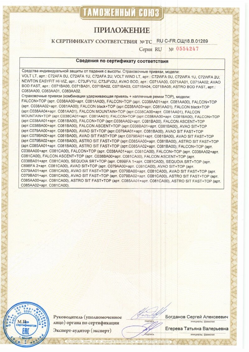 - В приложении к сертификату соответствия должны быть четко указаны, по каким стандартам испытывались изделия и чему они соответствуют. Например, если привязь была испытана только как страховочная (по стандарту ГОСТ Р ЕН 361-2008), мы не можем использовать ее для позиционирования, даже если такая возможность указана в инструкции.