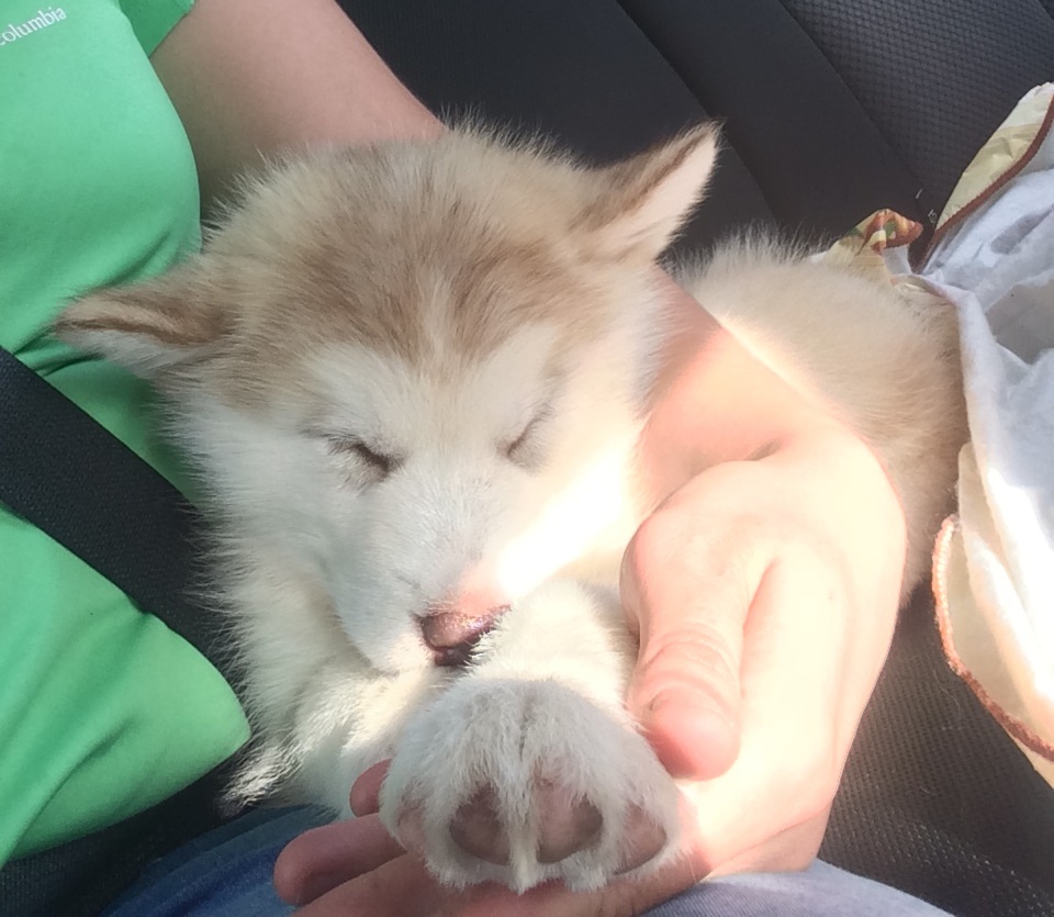 Но вот, все переживания позади, и мы едем домой с нашей месячной лапочкой-девочкой! Кстати, ехали мы за мальчиком волчьего окраса (такого себе представляли), но когда увидели всех щенков-мальчиков - мне никто не показался подходящим, а вот эта рыженькая девочка - я в неё влюбилась, а когда взяла на руки, и она ткнула свой коричневый нос в меня, то почувствовала, что она НАША.