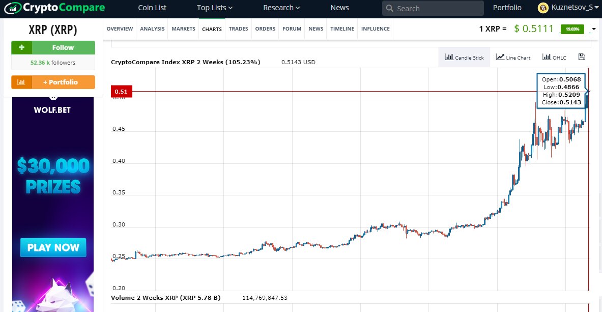 Оживление на криптовалютных рынках подстегивает новых инвесторов. Ripple начал сильный рост после того, как пробил зону сопротивления $ 0,3 по отношению к доллару США, сейчас цена уже преодолела 0.5 $.