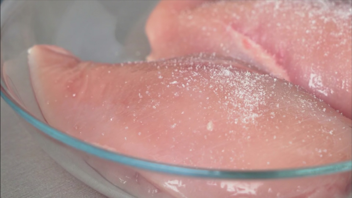 - Для начала хорошенько промываем куриную грудку и выкладываем в глубокую тарелку(миску) Солим по вкусу.
