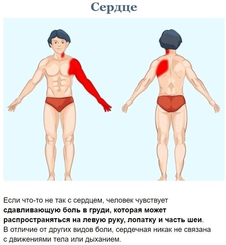 Инфарктэгиокард - сгусток крови, блокирующий движение крови в артериях сердца может быть причиной давящих, сжимающих болей в груди, длящихся более нескольких минут. Боль может отдавать (иррадировать) в область спины, шеи, нижней челюсти, плеч и рук (особенно левой)