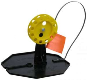 Катушка. Огромным достоинством будет катушка из пластмассы (чтобы в сильный зимний мороз можно было держать голыми руками), с несколько затруднительным ходом (иначе будет обеспечена “борода” в случае резкой поклёвки). Главное, чтобы ход катушки был не сильно затруднён, иначе рыба почувствует сопротивление и отпустит наживку. Места для лески должно быть много, чтобы ловить на больших глубинах. Сигнализатор поклёвки. Флажок выбирайте яркий (красный, оранжевый или ярко-зелёный) и большой.