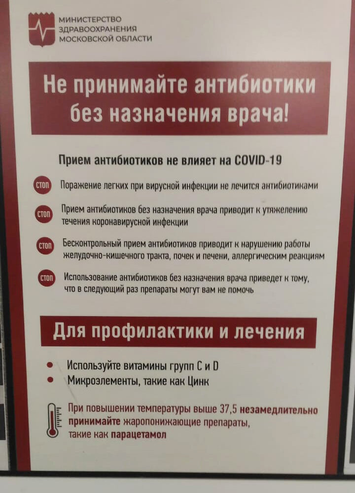 Оказавшись в городской поликлинике и ожидая приема у дежурного терапевта (по иной причине), обратил внимание на инфолисток с рекомендациями по профилактике и лечению коронавируса от Министерства здравоохранения Московской области.