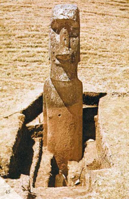 Принято считать, что эти статуи созданы «совсем недавно» — всего лишь 800 или самое большое 1500 лет назад. Такая датировка основана на анализе остатков угля и костей. Единственная проблема заключается в том, что установленные даты никак не объясняют, откуда взялся окружающий статуи слой булыжников глубиной в несколько метров. Когда статуи обнаружили, только головы находились на поверхности, туловища же оставались под землей. Мне посчастливилось с фотоаппаратом в руках побывать на острове Пасхи полвека назад, когда туда еще не хлынули потоки туристов. Я все задокументировал.