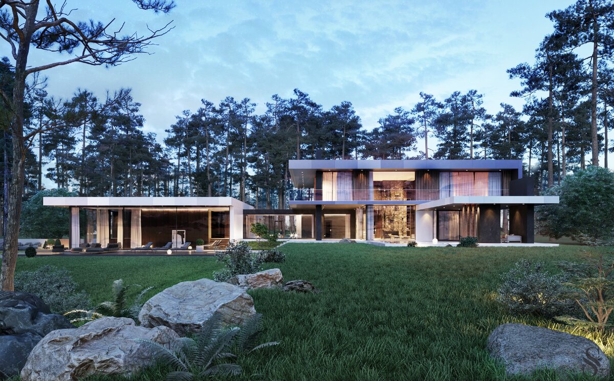 Представляем наш проект современного дома с плоской кровлей в пригороде Москвы, коттеджном посёлке Раздоры-1. Уникальность этого дома заключается в полном единении с ландшафтом участка и энергоэффективном панорамном остеклении, которое полностью стирает границы между уютным пространством внутри и великолепной природой снаружи. Особое внимание было уделено ландшафтному дизайну, как неотъемлемой части самого дома.