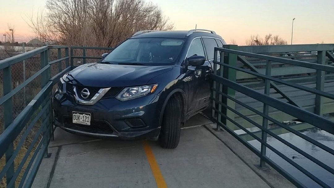 Кроссовер, известный у нас как X-Trail, не вписался в крутой поворот узкого моста, построенного исключительно для двухколесного транспорта, и застрял: ни вперед, ни назад. Водитель с места