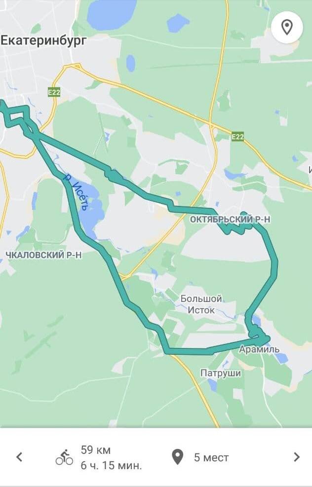 Арамиль - небольшой город, расположенный юго-восточнее Екатеринбурга и граничащий с ним за аэропортом "Кольцово". То есть расположение довольно близкое (от центра Екатеринбурга - 28 км), посильное для велопрогулки. Ниже - мой маршрут от Южного автовокзала и обратно. Из минусов: как ни строй маршрут, всё равно придется ехать по трассе. Выбрала так: туда - по Челябинскому тракту, обратно - по Арамильскому и Кольцовскому.