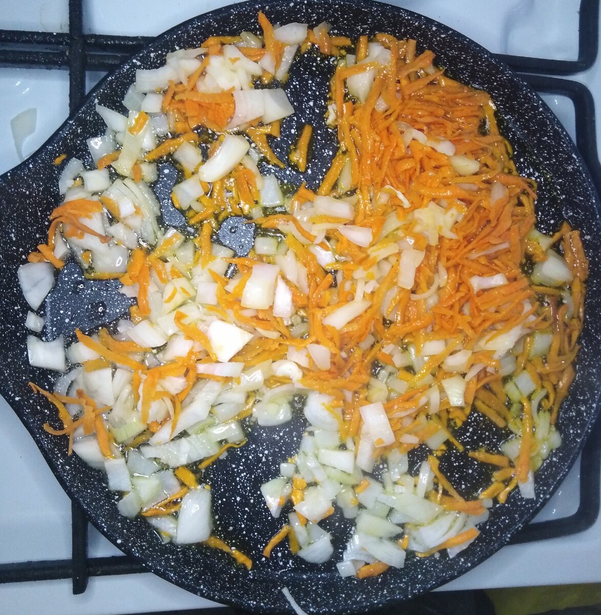 Трем морковь на средней тёрки и режем лук.