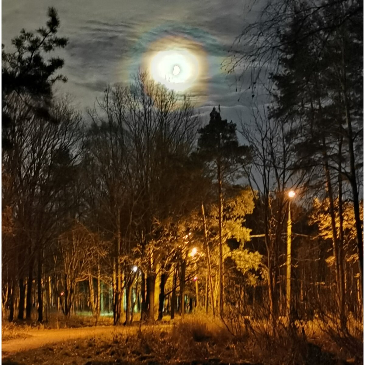 Не каждый вечер встречаешь такую луну. Когда увидела - замерла от восторга. Ореол прямо магический... Длилось сияние несколько минут, а потом тучи рассеялись.