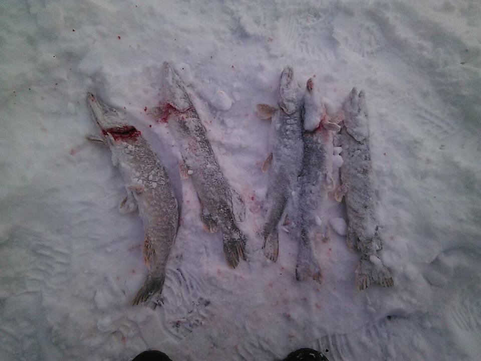 Переставляем жерлицы каждый час, подъемов много, щука вся не крупная, видимо мелкие щурята играют с живцом, дергают его и бросают. Подъемы продолжаются до 12.00, потом как обрезало. Поймали 6 щучек в районе килограмма полтора, дальнейшее переставление, обновление живцов не принесло результата. Время еще есть, беру судаковую удочку, вешаю балансир 5 и пошел по лункам, три четыре взмаха и дальше, на очередной лунке под берегом, удар, висит килошная щука, балансир в лунку, на первом взмахе удар и срез. Снимаем все жерлицы, вяжу поводок из флюра, балансир 7 и пошел по лункам, где только что сняли жерлицы, итог два схода и три щуки. Все, пора домой. Славно провели время.