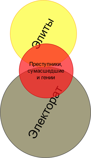 На диаграмме преступники, сумасшедшие и гении перекрывают области электората и элит. Это потому, что они присутствуют в любой прослойке: