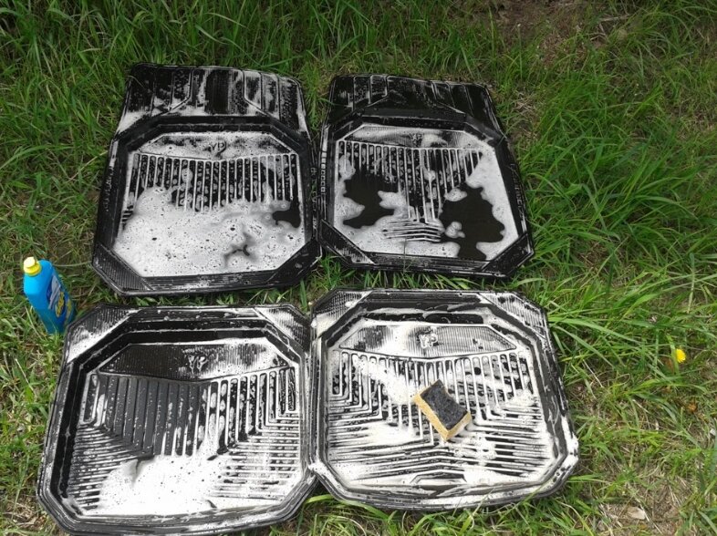 Первым делом, необходимо подготовить коврики. Для этого тщательно моем коврики с использованием щетки и либо автохимии, либо мыла, чтобы вычистить всю грязь, которая забилась в поры ковриков.