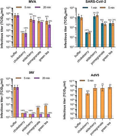 Для оценки вирусидального потенциала четырех растительных продуктов мы провели количественный тест подвески с использованием MVA (EN 14476и 10),который является устойчивым суррогатным вирусом, который используется для проверки вирусидальных дезинфицирующих средств против всех окутанных вирусов в соответствии с Европейским руководством по регулированию биоцидных продуктов No11. Хотя никакого снижения вирусного титра не наблюдалось при инкубации с контрольным буфером, 5-минутная инкубация с дроссельным соком, соком бузины, гранатовым соком или зеленым чаем дала 3,17, 0,67, 1,0 или 1,0 бревна10 снижение инфекционности, соответственно ( Рисунок1, Таблица 1), указывая, что проверенные продукты, как правило, активны против окутанных вирусов. Инкубационное время в 20 минут было лишь незначительно более мощным, что свидетельствует о быстром действуя противовирусный эффект. Затем мы проанализировали два респираторных окутанных вирусов, ответственных за "свиной грипп" в 2009/2010 году и продолжающейся пандемии COVID-19, IAV и SARS-CoV-2, соответственно, а также AdV5 в качестве голого вируса контроля. 5-минутная инкубация с дроссельным соком дала наиболее мощные противовирусные препараты и инактивированные МАВ, ТОРС-КоВ-2, а также AdV5 до 99,99%, 96,98% и 93,23%, соответственно(рисунок 1, таблица 1). IAV был наиболее восприимчивым ко всем продуктам и инфекционность снижается на 99% бузины сок, гранатовый сок и зеленый чай. SarS-CoV-2 титеры были сокращены примерно на 80% гранатовым соком и зеленым чаем уже после 1-минутной инкубации, однако, не зависит от бузины сок, соответствующий результатам, полученным с более устойчивым суррогатной MVA. Голый AdV5 был устойчив к трем из четырех продуктов, однако, восприимчивы к дроссельного сока (Рисунок 1, Таблица 1). Таким образом, IAV очень восприимчив ко всем анализируемым продуктам, в то время как SARS-CoV-2 может быть эффективно инактивирован соком дроссельной ягоды и находится на более низком уровне, подверженном воздействию гранатового сока или зеленого чая.