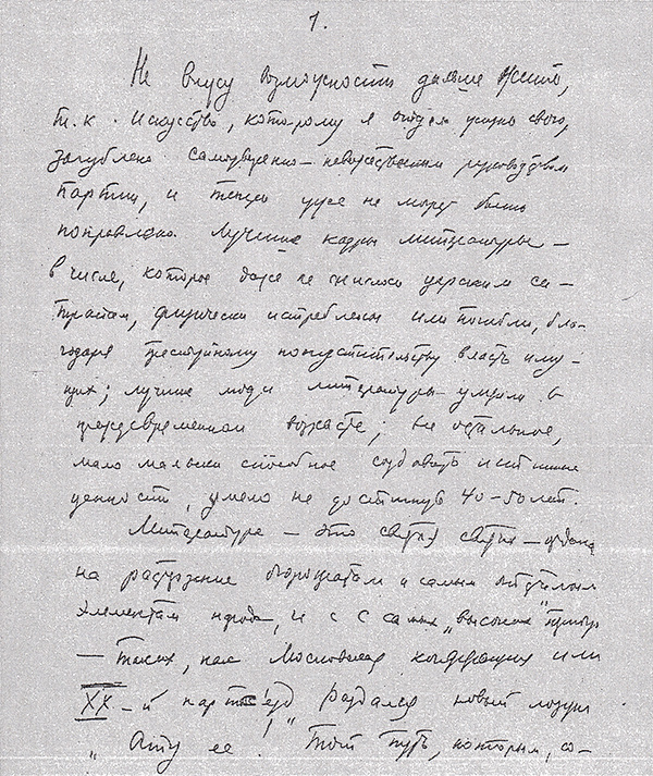 Вот Фадеев и обвинил ЦК КПСС в уничтожении «ленинских принципов руководства» и страной, и советской литературой. «Лучшие кадры литературы - в числе, которое даже не снилось царским сатрапам, физически истреблены или погибли, благодаря преступному попустительству власть имущих; лучшие люди литературы умерли в преждевременном возрасте; все остальное, мало-мальски способное создавать истинные ценности, умерло, не достигнув 40-50 лет. Литература -- это святая святых -- отдана на растерзание бюрократам и самым отсталым элементам народа, и с самых «высоких» трибун -- таких как Московская конференция или XX партсъезд -- раздался новый лозунг «Ату ее!», -- писал Фадеев.